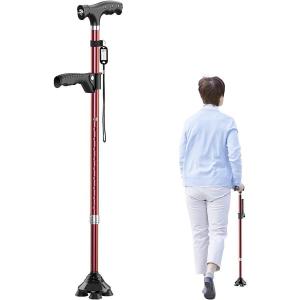 ステッキ 杖 倒れない 自立式4点杖 男女兼用 10段階調節 クレバーケーン伸縮式 軽量 アルミ製 補助ハンドル付き(赤色)