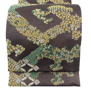 袋帯 名品 樹木 草花 西陣織 手織 焦茶色 六通 正絹 中古