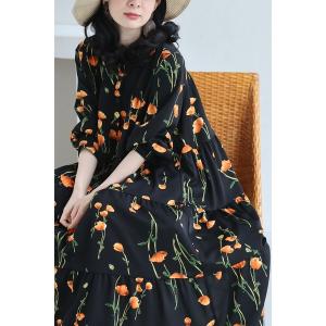 Sから2L対応 黒 夕陽色に染まる花柄ロングワンピース 紐付き