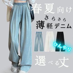 デニムパンツ レディース 春夏 夏デニム 薄手デニム ワイドパンツ 涼感 ウエストゴム ハイウエスト 楽チン ジーンズ サイドポケット タックパンツ 涼しい 夏服