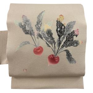 美品 名古屋帯 逸品 人間国宝 羽田登喜男 落款あり かぶ 縮緬 灰緑 正絹 中古