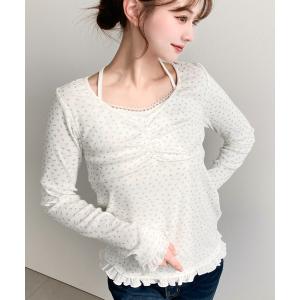 tシャツ 無地×ドット×花柄フロントレースギャザーリボン長袖トップス レディース