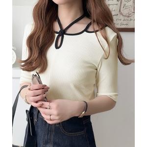 tシャツ デコルテを美しく演出する。パイピング配色リブカットソー(半袖) レディース