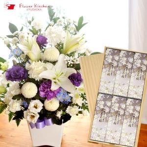 お盆 新盆 お彼岸 お供え 花 お線香とお花 洋花を使った ユリのお供えアレンジMサイズと 黒塗り箱入り特選淡墨の桜線香セット 喪中見舞い FKAA