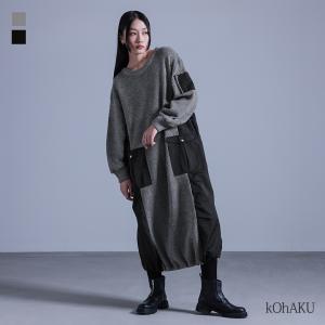 「送料無料」ワンピース 長袖 レディース ニットワンピ ロング丈 ナイロン 配色 切り替え 異素材 ポケット モード カジュアル 秋 冬 秋冬「メール便不可」「50」