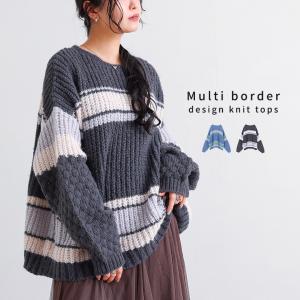 ニット レディース トップス ニットトップス 長袖ニット クルーネック ローゲージニット マルチボーダー 配色 秋 冬 オシャレウォーカー「メール便不可」「40」