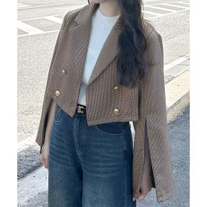 ジャケット テーラードジャケット マットゴールド釦グレンチェックダブルテーラードジャケット レディース
