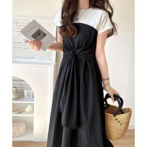 ワンピース 一枚で旬のワンピスタイルが完成♪ビスチェ風2wayリボン使いサッカー素材ドッキングロングワンピース(半袖)