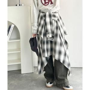 スカート 「mily bilet」旬のレイヤード風スタイルが楽しめる!シャツ巻き風チェック柄スカート(ロング丈)