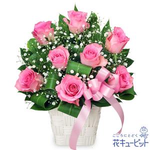 【誕生日フラワーギフト】花キューピット 女性 男性 彼氏彼女 夫妻 父母 ギフト プレゼント ピンクバラのウッドバスケットアレンジメント