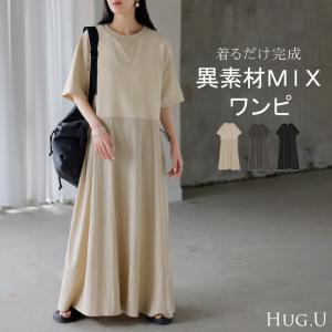 ワンピース ロング 異素材 MIX レディース ワンピ ロングワンピース Aライン マキシ マキシワンピース ドロスト 裾ドッキング 綿100 ワッシャー 軽い 薄手 大判