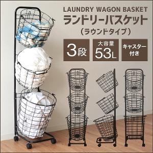 ランドリーバスケット 3段 53L 大容量 キャスター付き スチール製 省スペース 洗濯かご 脱衣かご ワイヤーバスケット ワイヤー