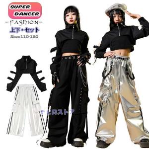 k-pop 衣装 キッズ へそ出し トップス ダンス衣装 女の子 セットアップ シルバーパンツ 長袖 かっこいい ヒップホップ 韓国 k-pop衣装 ジャズダンス 黒 ワイドパ