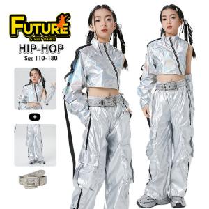 k-pop 衣装 シルバー アウター 片袖 袖カバー キッズダンス衣装 セットアップ ヒップホップ へそ出し トップス 女の子 光沢 カーゴパンツ ロングパンツ 銀色 k-p