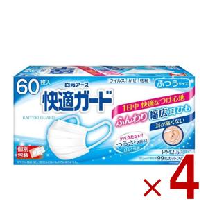 白元アース 快適ガード マスク ふつうサイズ 個別包装 60枚入 不織布 個包装 耳が痛くない 毛羽立たない 4個