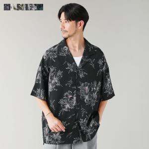 オープンカラーシャツ シャツ メンズ 春 夏 半袖 5分袖 ポリエステル オープンカラー デザインシャツ 総柄 プリント サイドスリット 速乾性 M L