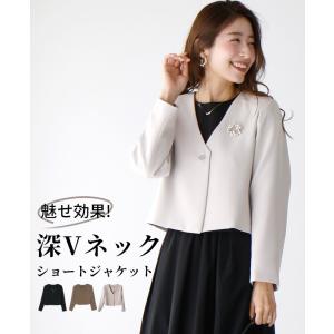 長袖 ジャケット Vネック ショート丈 ブラック デザイン ノーカラー お手入れ簡単 ブラック ブラウン グレージュ 肩パット 羽織り