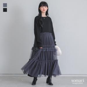 ワンピース 長袖 レディース ドレス ロングワンピース スウェット チュール フリル ドッキング ゆったり 40代 秋 冬「メール便不可」「30」