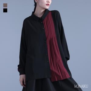 シャツ レディース トップス ブラウス 襟付き 長袖 配色 プリーツ アシンメトリー アシメ スリット パイピング ヨーク タック ボタンシャツ「メール便可」「10」