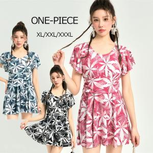 ワンピース水着 体型カバー水着 大きいサイズ レディース ママ水着 オールインワン フレア 花柄 ぽっちゃり カバーアップ ブラック グリーン ピンク XL-3XL