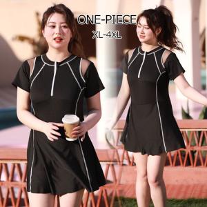 水着 ワンピース 体型カバー水着 レディース 大きいサイズ ぽっちゃり かわいい オールインワン 長袖 黒 フリル キャンディスリーブ 透け ブラック XL-4XL