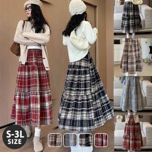 チェック柄 ロングスカート レディース S〜3L 秋冬 ティアード スカート フレア マキシ丈 ウエストゴム 体型カバー 大きいサイズ 暖かい 裏起毛風 かわいい