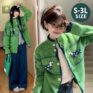 犬柄 カーディガン レディース S〜3L ニット セーター ノルディック風 北欧風 可愛い アニマル柄 厚手 長袖 秋冬 羽織り ゆったり 大きいサイズ 体型カバー 防寒
