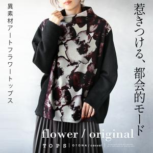 惹きつける都会的モード 異素材アートフラワートップス 花柄 体型カバー ニットソー 大きいサイズ 秋レッド ボルドー OTONA 40代 50代 60代