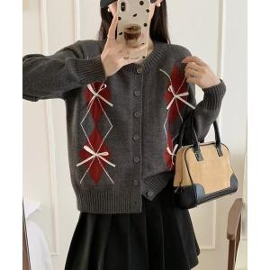カーディガン リボン付きアーガイル柄ニットカーディガン レディース