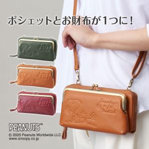 スヌーピー スマホも入る 本牛革 がま口ポシェット SNP009 スマホ 財布 カード 札入れ 小銭入れ ファスナー ショルダー ストラップ付き クリ