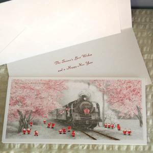 日本の風景のクリスマスカード『日本を旅する小さなサンタ〜大井川鉄道SL蒸気機関車と桜』【ネコポス可】