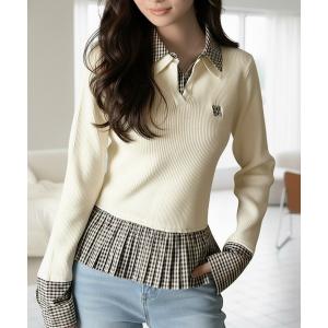 ニット セーター 「mily bilet」ニット×チェックプリーツで叶える!旬のレイヤードスタイル♪異素材切り替えニットプルオーバー レディース