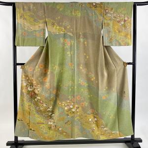 訪問着 身丈152cm 裄丈64cm M 袷 松井青々 落款あり 草花 七宝 金銀糸 刺繍 よもぎ色 正絹 名品 中古