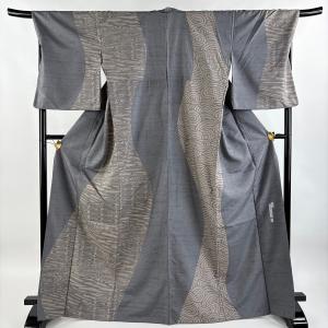 付下げ 身丈168cm 裄丈70cm L 袷 川村久太郎 紬地 落款あり 観世水 幾何学模様 灰色 正絹 名品 中古