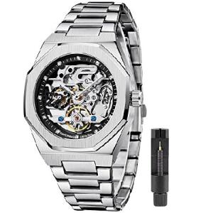 【並行輸入品】 機械式メンズウォッチ ファッション 自動巻き 男性 時計 ブルー ステンレススチール 防水 ビジネス スケルトンウォッチ, シルバーブラック, クォ
