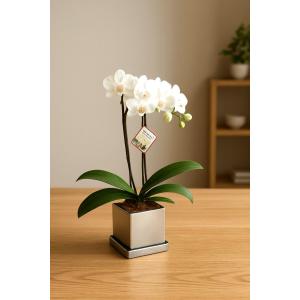 ミディ胡蝶蘭 小雪 2本立ち クローム鉢(こちょうらん) 誕生祝い 花 産地直送 フラワーギフト 洋ラン 胡蝶蘭 開店祝い 開業祝い お祝い 鉢植え