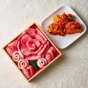 お正月 お年賀 焼肉ホットプレート お重 肉おせち 2026 肉 ギフト 焼肉セット 国産牛 高級 牛タン 大輪の花が咲くキムチ付き 380g