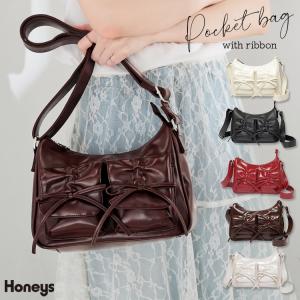 ショルダーバッグ バッグ 鞄 合皮 フェイクレザー ファスナー開閉 アウトポケット ダブルポケット レディース 雑誌掲載 Honeys ハニーズ リボン付ポケットバッグ