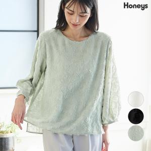トップス カットソー 長袖 チュール 花柄刺繍 フリルネック ボリューム袖 裏地付き ガーリー オールシーズン レディース Honeys ハニーズ チュール刺繍トップス