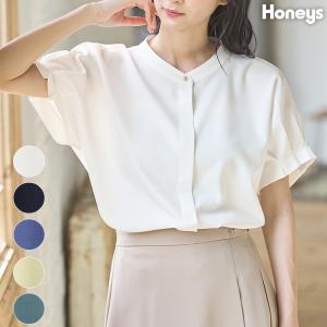トップス ブラウス 半袖 袖タック デザイン袖 フロントボタン ストレッチ 麻調 SALE Honeys ハニーズ 袖タックブラウス