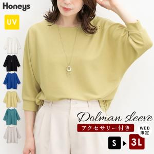 トップス カットソー アクセ付ドルマン UVカット 大きいサイズ ドルマン袖 再生 SALE Honeys ハニーズ 7分袖アクセ付ドルマン