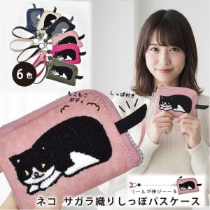 ネコ ポーチ サガラ織り リール付き パスケース 小銭ポーチ 財布 レディース メンズ 伸びるリール 手首ストラップ かわいい 6色 1150 猫の日