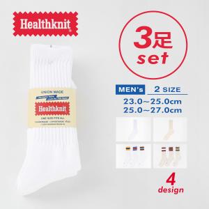 【3足セット】 ソックス 靴下 メンズ 男性用 クルーソックス リブソックス スポーティー 綿混 無地 ロゴ ホワイト ベージュ ボーダー Healthknit ヘルスニット