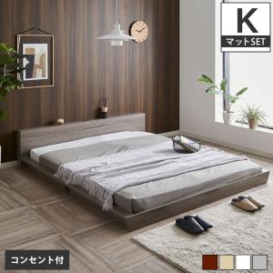 Platform Bed ローベッド キング 20cm厚 ポケットコイルマットレス付 棚付きコンセント2口 木製ベッド フロアベッド ステージベッド すのこ