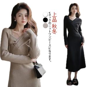 ニットワンピース 全3色 フロントクロス Vネック Aライン 黒 長袖 リブニット ロングワンピース ロング丈 ミモレ丈 きれいめ スリム デイリー