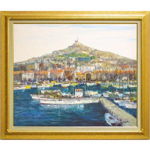 酒井健吉 「 マルセイユ 」 油絵 油彩画 F20 ( 20号 ) 絵画 肉筆 手描き 外国の風景 ヨーロッパ フランス 港 船 海 大きい絵 送料無料