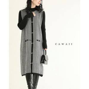 Sから2L対応 黒 ライン上に艶めくパールの千鳥格子柄ニットミニワンピース
