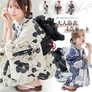 レディース 浴衣 4点set 4点セット 兵児帯 下駄 ストライプ 桜 さくら 椿 つばき 菊 ゆかた 大人可愛い お洒落 かわいい 大人 ベージュ 白 黒 ブラック 紺 赤 青