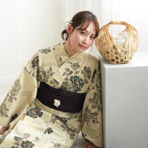 浴衣 レディース セット ニコアンティーク 高級変わり織 浴衣3点セット からしのバンブーストライプと菊影絵 フリーサイズ 浴衣セット(ゆかた・帯・下駄)