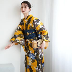浴衣 レディース セット ニコアンティーク 高級変わり織 浴衣3点セット黄色と墨色の立沸とレトロ花 フリーサイズ 浴衣セット(ゆかた・帯・下駄)レトロ